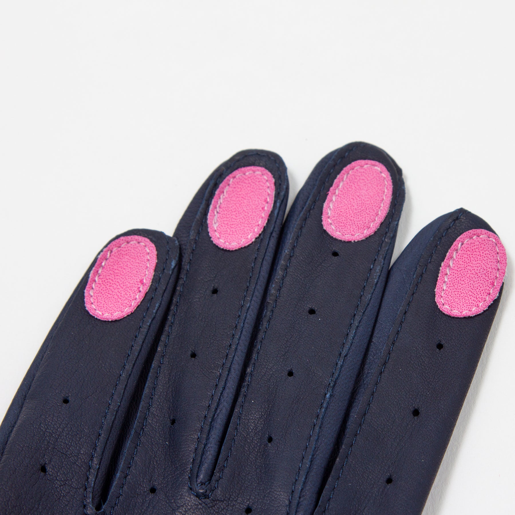 柔らかなレザーが手にフィットするグローブはマニュキアの爪がスタイリッシュです。手首までくる長さが嬉しい本格派のグローブです。ネイビー牛革タイ製